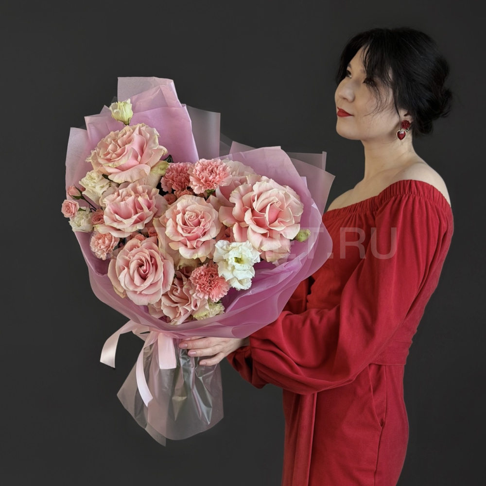 Букет из розовых роз с гвоздиками и эустомой