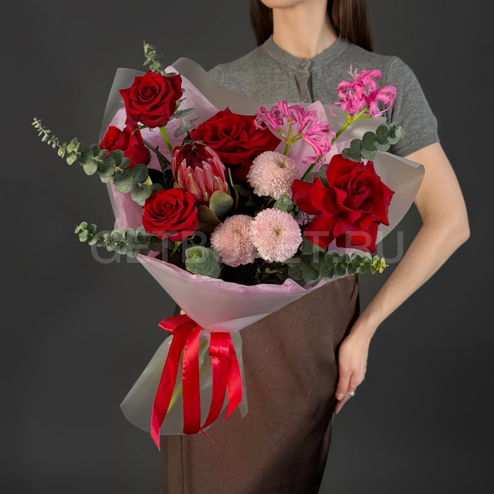 Букет из роз, нерине и протеи с эвкалиптом