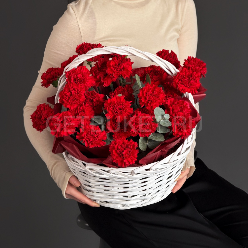 Цветочная композиция из гвоздик в плетеной корзине