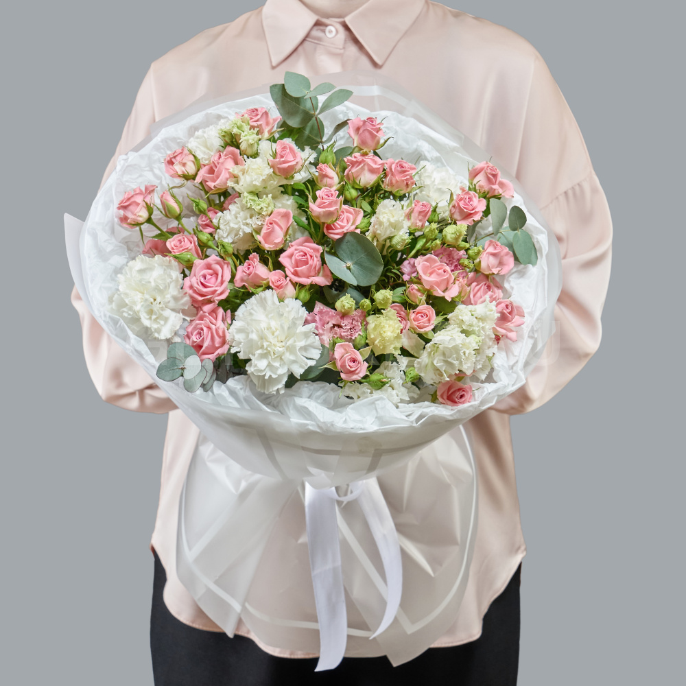 Букет из белых роз, кустовой хризантемы и альстромерии с эвкалиптом7 690 ₽Букет из белых роз, кустовой хризантемы и альстромерии с эвкалиптом 7 690 ₽ -