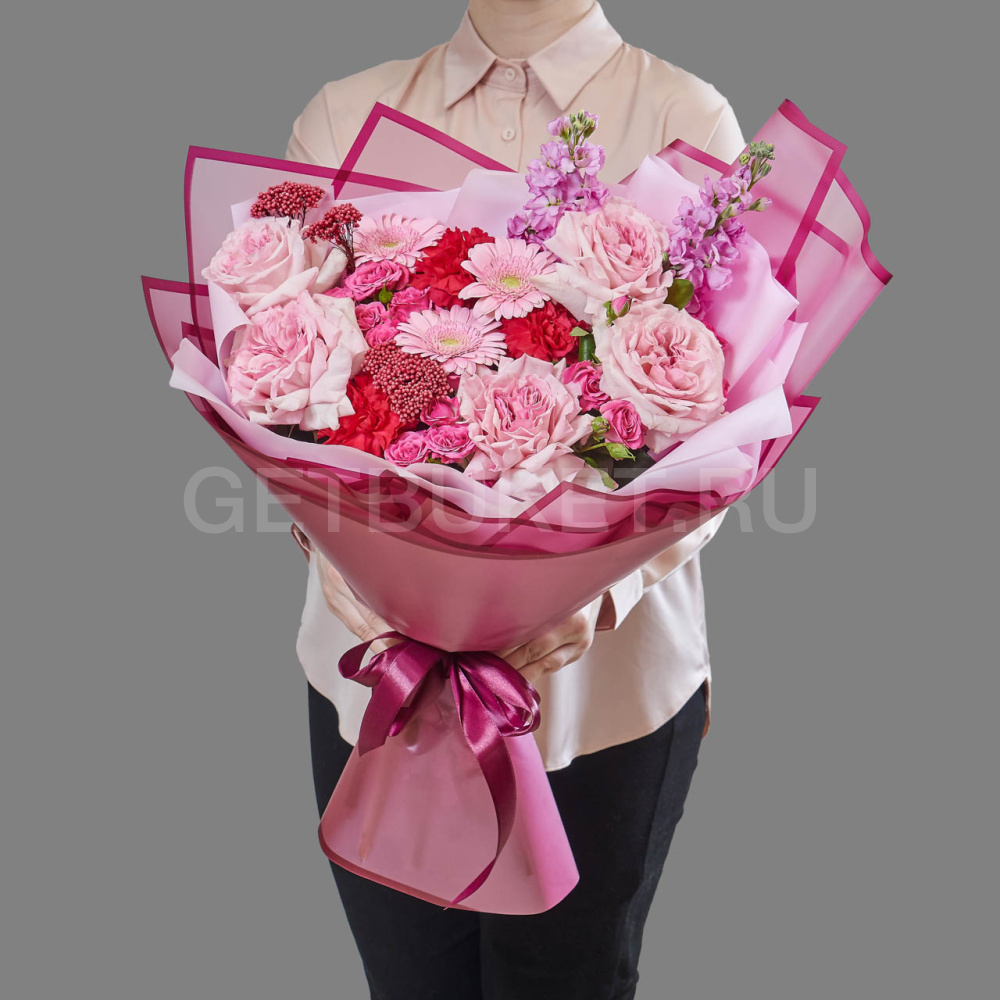Розовый букет из гвоздик, роз и маттиолы