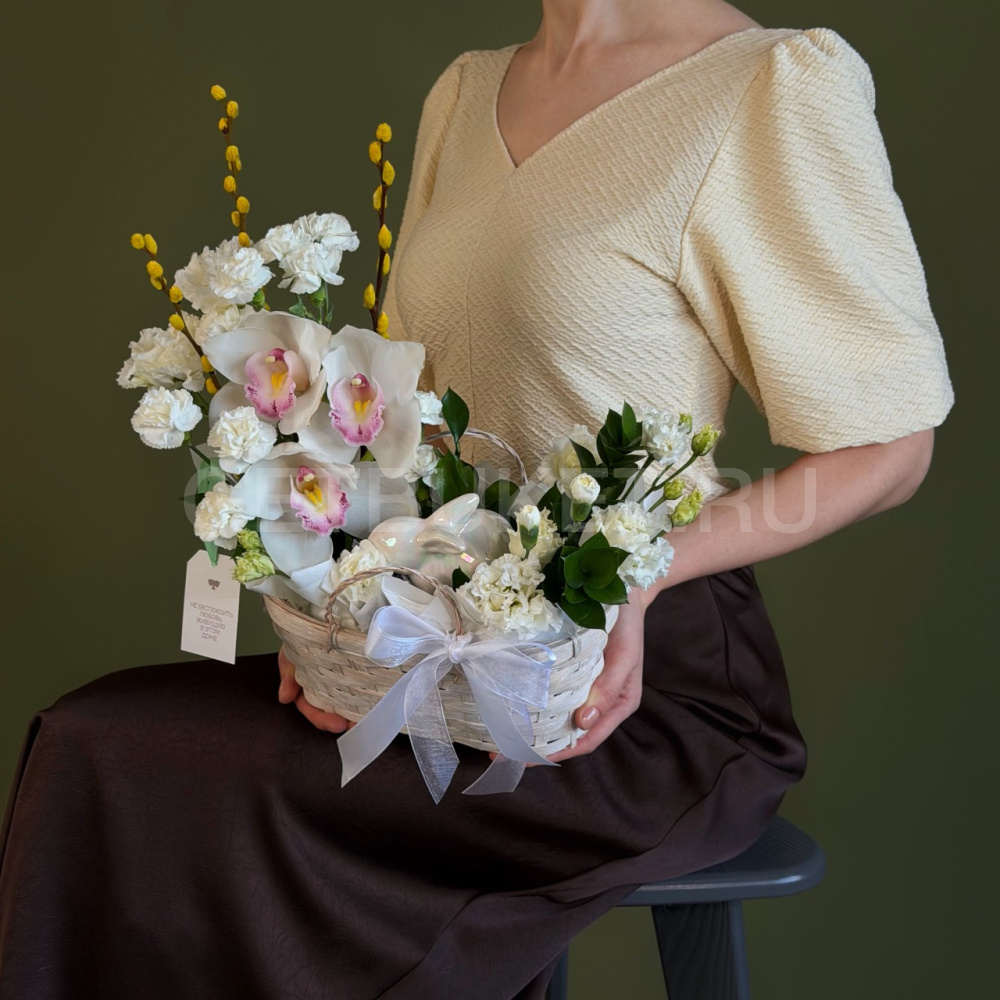 Цветочная композиция с гвоздиками, нарциссами и вербой в плетеной корзине3 900 ₽Цветочная композиция с гвоздиками, нарциссами и вербой в плетеной корзине 3 900 ₽ -